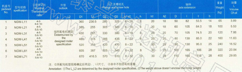 产品由NGW—L型单级L11-L71,两级L42—L122两种系列组成,适用于;台金起重运输轻化及通用机械设备,适用条件如下: